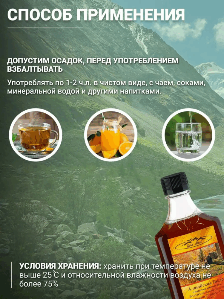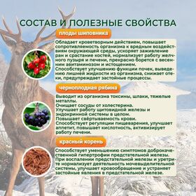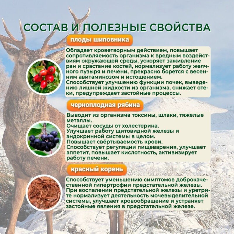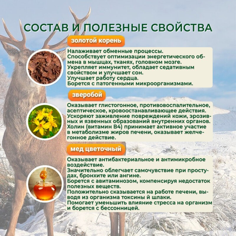 Состав: шиповник, черноплодная рябина, красный корень, золотой корень, панты, зверобой, сахар, вода очищенная, мед натуральный цветочный.