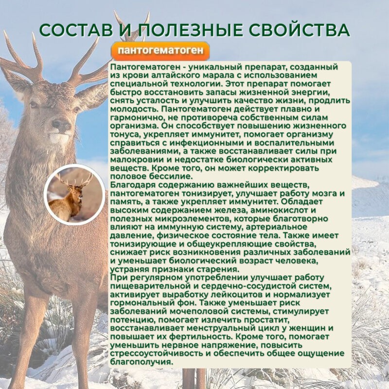 Панты — благотворно действуют на иммунную систему, артериальное давление, физическую работоспособность. Они обладают тонизирующими и общеукрепляющими свойствами.