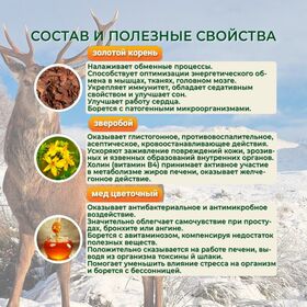 Золотой корень – налаживает обменные процессы, способствует оптимизации энергетического обмена в мышцах, тканях, головном мозге, также укрепляет иммунитет, обладает седативным свойством и улучшает сон.