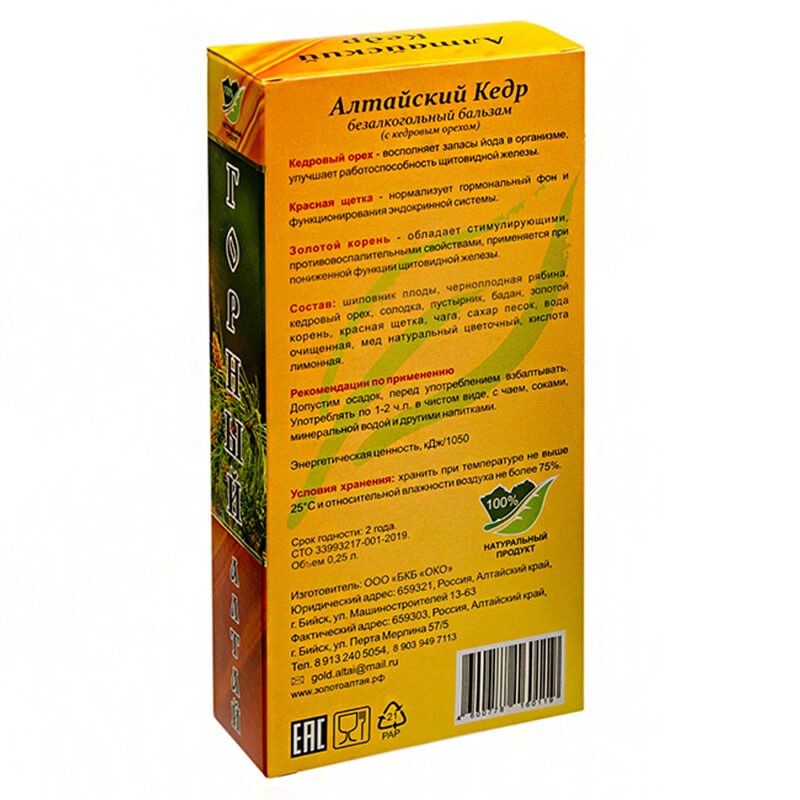 Состав: шиповник, черноплодная рябина, кедровый орех, солодка, пустырник, бадан, золотой корень, красная щетка, сахар, вода очищенная, мед.