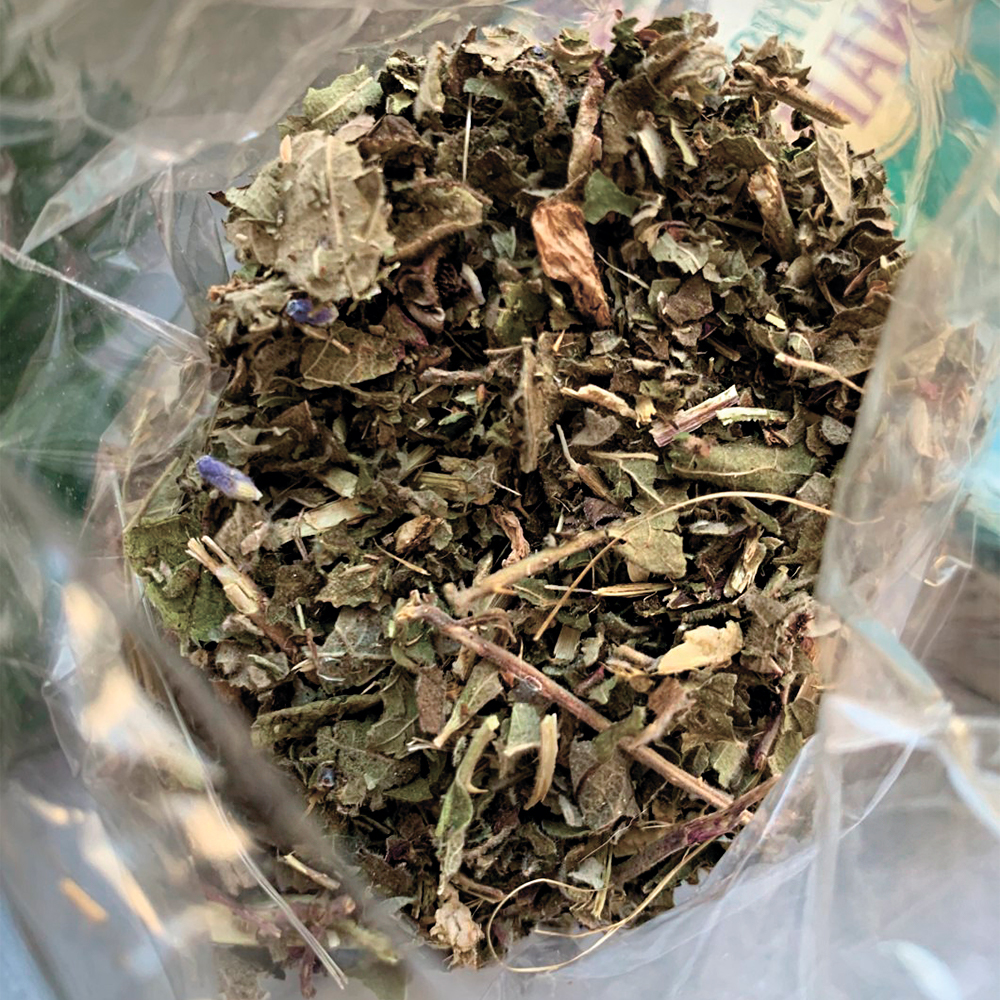 Состав: цветки лаванды, крапива, лист ежевика, иссоп, мята, чабрец, зверобой, котовник, железняк, лепестки розы, цветки бузины.