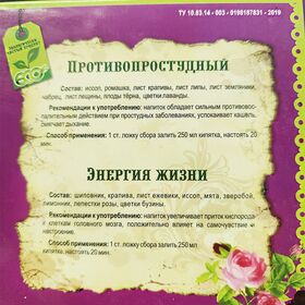 Состав: цветки лаванды, крапива, лист ежевика, иссоп, мята, чабрец, зверобой, котовник, железняк, лепестки розы, цветки бузины.