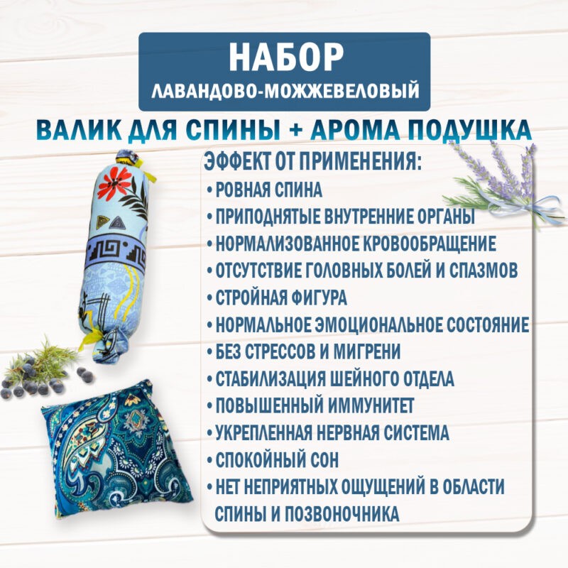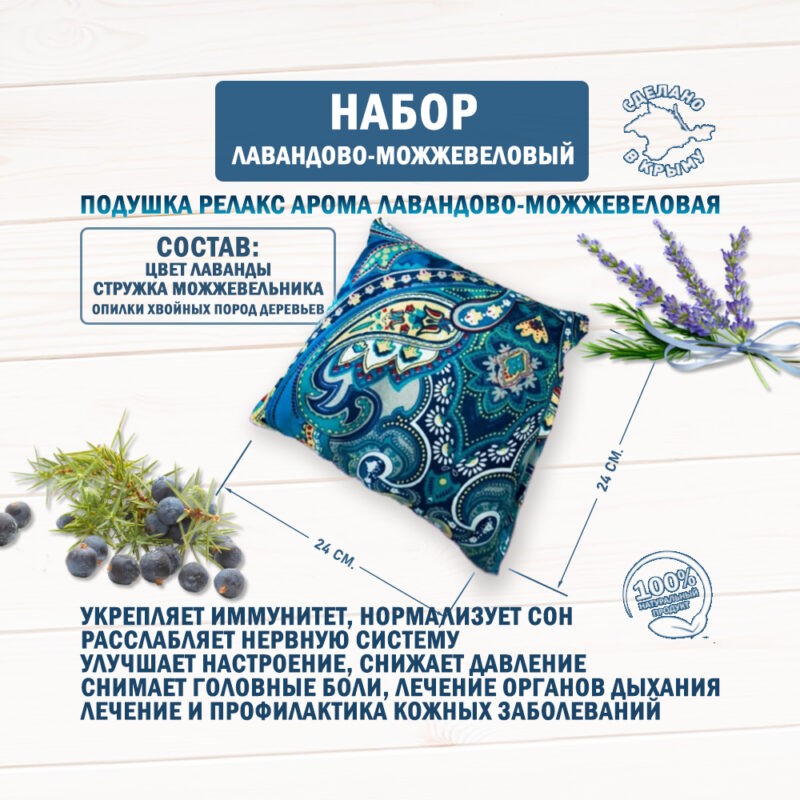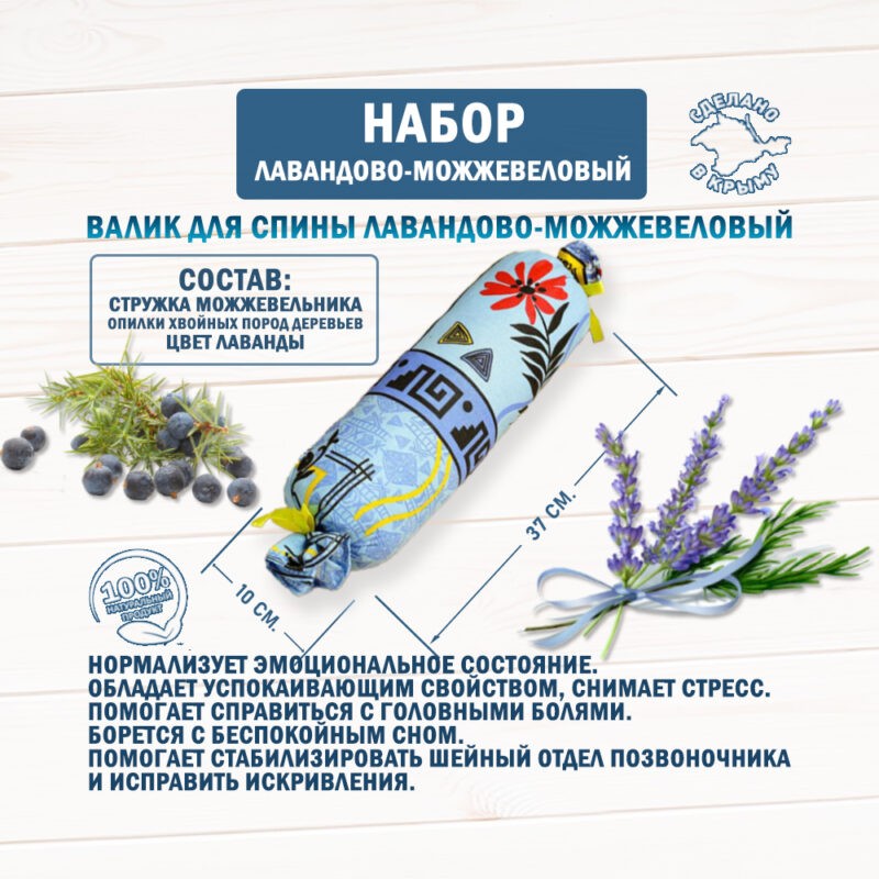 The set with an anti-stress pillow is a unique combination of the aroma of blooming Crimean fields and the healing properties of Crimean nature! The set includes an aroma pillow and a bolster filled with lavender and juniper herbs.