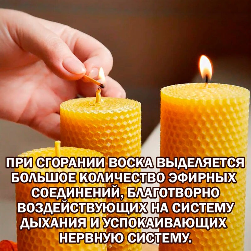 При сгорании воска выделяется большое количество эфирных соединений, благотворно воздействующих на систему дыхания и успокаивающих нервную систему.