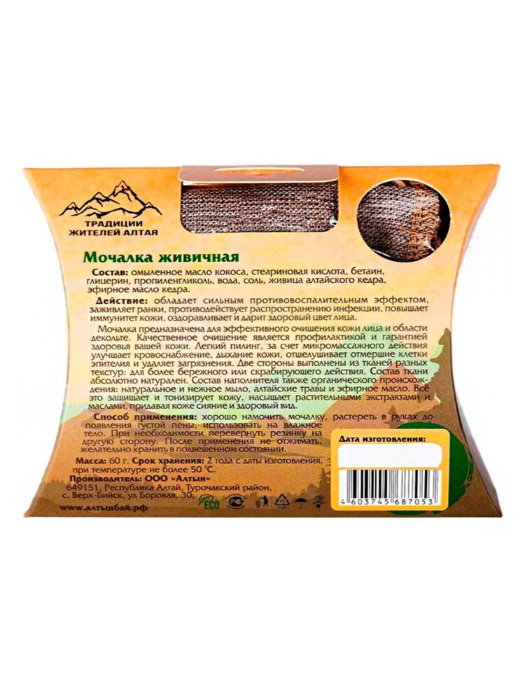 Способ применения: хорошо намочить мочалку, растереть в руках до появления густой пены, использовать на влажное тело. При необходимости перевернуть резинку на другую сторону. После применения не отжимать, желательно хранить в подвешенном состоянии.