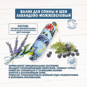 В качестве наполнителя используется стружка настоящего можжевельника и цвет лаванды, обладающих уникальными целебными свойствами. От валика исходит легкий аромат лесной поляны. Запах нерезкий и достаточно приятный, с первых секунд чувствуется успокаивающее действие на организм. Перед использованием валика, его содержимое рекомендуется немного взбить руками, тогда аромат усилится.